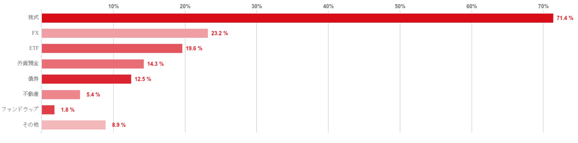 アンケートによれば、「株式」に投資している人の割合が71.4%で圧倒的に高く、これに「FX(23.2%)」と「ETF(19.6%)」が続く形となった。