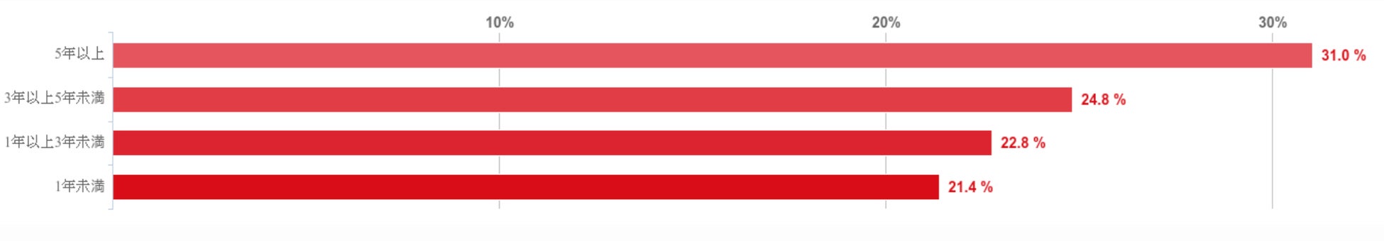 アンケートによれば、40代の投資信託の運用経験は「5年以上」が最も多く、全体の31.0%を占めている。そこから、「3年以上5年未満」が24.8%、「1年以上3年未満」が22.8%、「1年未満」が21.4%と続く形となった。