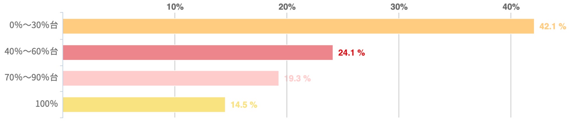 アンケートによれば、「0%〜30%台」が42.1%で最も多くなった。その後は、「40%〜60%台」が24.1%、「70%〜90%台」が19.3%、「100%」が14.5%となっている。