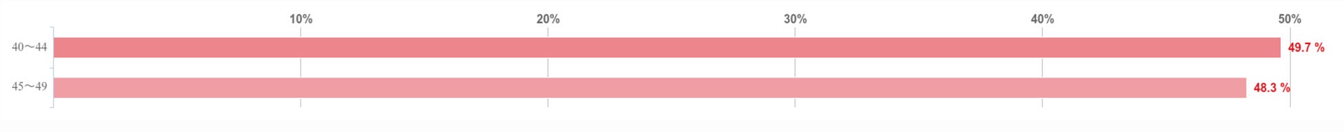 40代のポートフォリオの中で投資信託が占める割合としては、「0%〜30%台」が49.2%で最も多くなり、「100%」と回答したのは14.5%に留まった。こうなった理由として、「全体の保有資産の中で投資信託が占める割合」を回答した投資家が一定数いたことが推測される。
