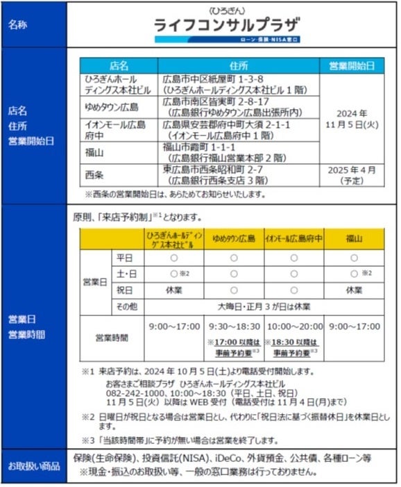 株式会社広島銀行(頭取 清宗 一男)では、平日の来店が難しい個人のお客さまでも、土日も含め、ローン・保険・資産運用(NISA)など、幅広いご相談が可能な拠点として、「〈ひろぎん〉ライフコンサルプラザ」を開設いたしますので、下記のとおりお知らせいたします。