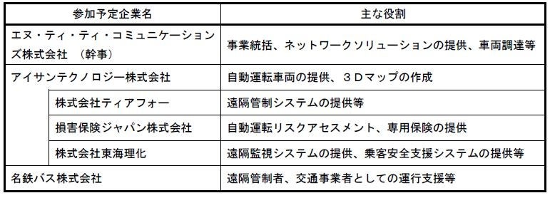 当社は、アイサンテクノロジー株式会社(本社:愛知県名古屋市、代表取締役社長:加藤 淳)株式会社ティアフォー(本社:愛知県名古屋市、代表取締役社長:加藤 真平)、および、株式会社東海理化(本社:愛知県丹羽郡大口町、代表取締役社長:二之夕 裕美)の協力会社とともに参画します。