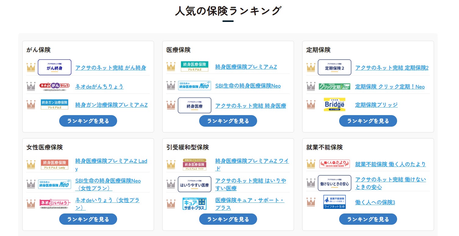 ※ランキングは各保険商品の優劣や推奨を示すものではなく、特定期間の申込件数、資料請求件数、及びアクセス数に基づいて作成したものです。
