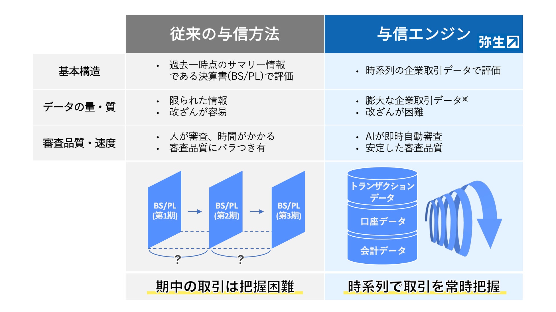 弥生では、会計データを基に与信判断を行う与信エンジンを金融機関に提供しています。会計データが持つ、事業者の事業活動の全体を詳細かつその動きまで把握することができるデジタルデータという特徴を活かし、弥生の与信エンジンではAIによって会計データを時系列で評価しています。