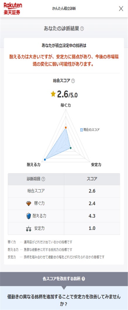 楽天証券株式会社(本社:東京都港区、代表取締役社長:楠 雄治、以下「楽天証券」)は、2024年10月20日(日)より、お客様の現在の投資信託積立設定情報から、「稼ぐ力」・「耐える力」・「安定力」の各スコアや、それらの各スコアをもとに算出する「総合スコア」を診断し、追加で積み立てると各スコアが改善できる投資信託を1つずつ提案する、ロボアドバイザー「かんたん積立診断」の提供を開始することをお知らせします。これにより、お客様は現在の投信積立設定の評価を知り、より良いポートフォリオに近づけられる次の投資信託を知ることが可能になります。