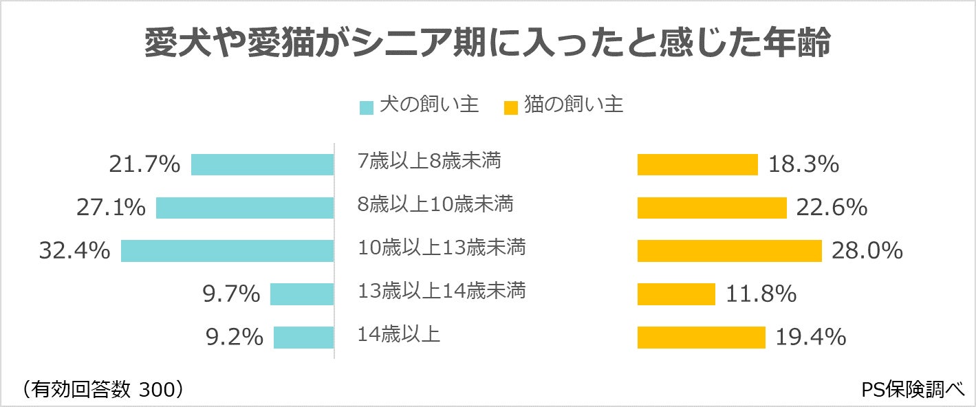 飼い主に愛犬や愛猫がシニア期に入ったと感じた年齢について調査した結果、それぞれのシニア期に対する認識に違いが見られました。