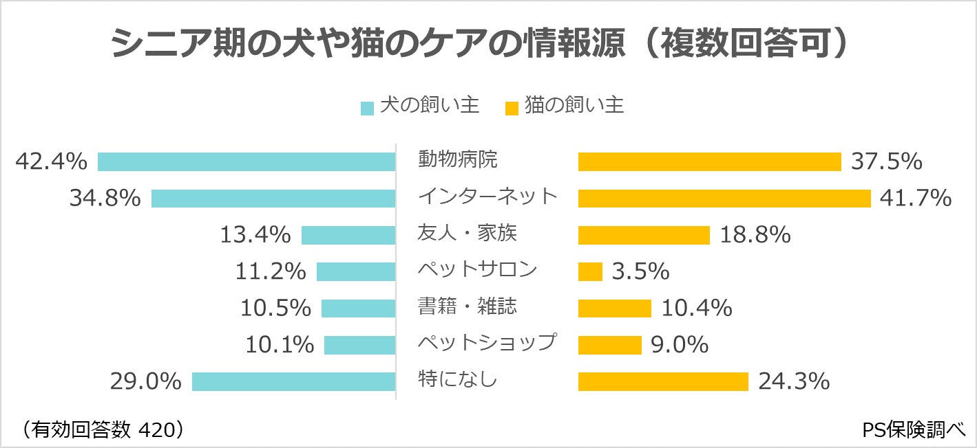 シニア期の愛犬や愛猫のケアについて、飼い主はどこから情報を得ているのかを伺いました。その結果、それぞれの飼い主の情報源に違いが見られました。
