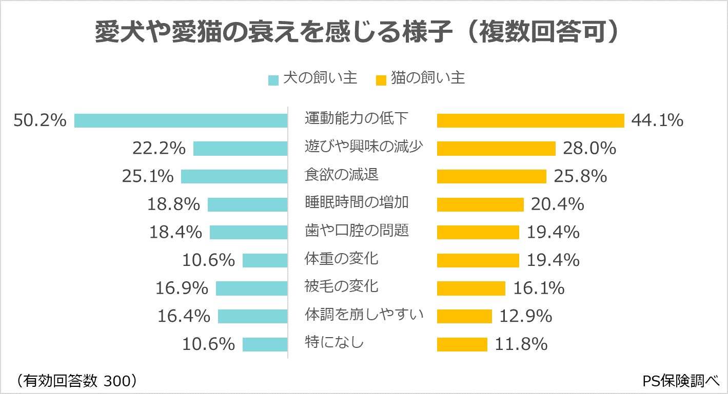 愛犬や愛猫の衰えに関する調査の結果から、飼い主がそれぞれに感じる変化に明確な違いが見られました。