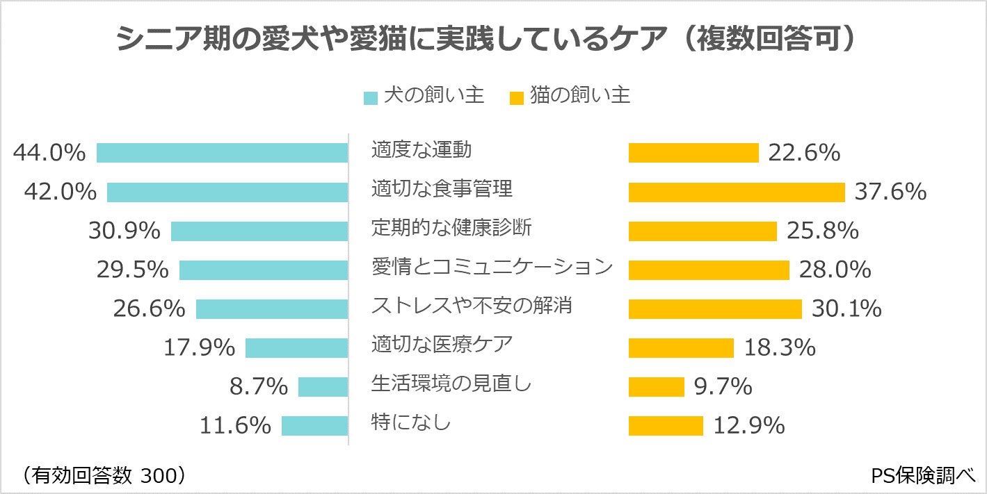 飼い主はシニア期の愛犬や愛猫に、どのようなケアを実施しているのでしょうか。調査の結果からそれぞれの飼い主にとって、重視する点が異なることが浮き彫りになりました。