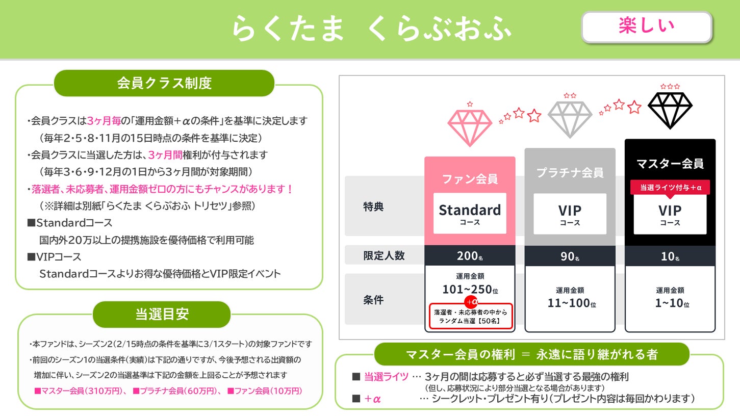 本ファンドへの投資額は「らくたま くらぶおふ」(シーズン2=2025年3月1日から3ヶ月)の参加基準となる2月15日時点の運用金額に合算されます。魅力的な特典が満載の「らくたま くらぶおふ」にぜひご参加ください。詳細はこちらのPDF資料「らくたまWORLD(新しい冒険をはじめよう!)」をご確認ください。