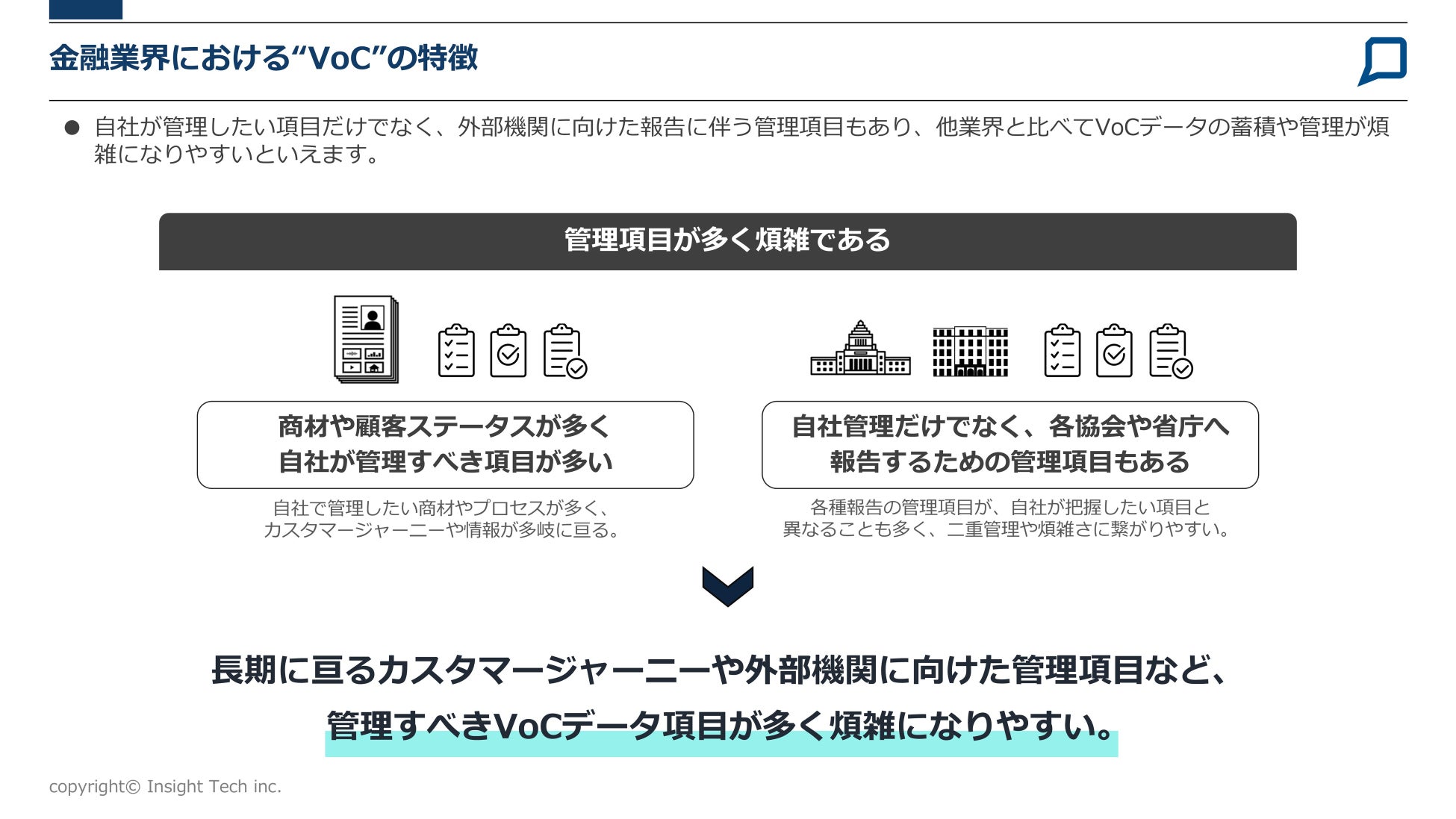 VoC活用を【経営レベル】で【仕組み化】していくような“VoC経営”を経営戦略の柱にしていく企業が増えている中で、金融業界におけるVoCデータは「デリケート」かつ「煩雑になりやすい」データであり、その活用に難しさを感じている企業様も多くいらっしゃいます。