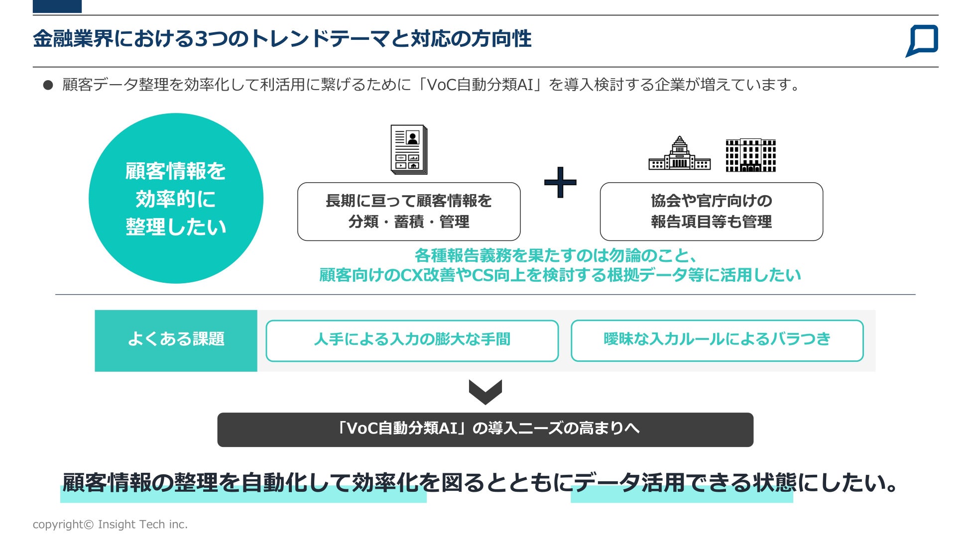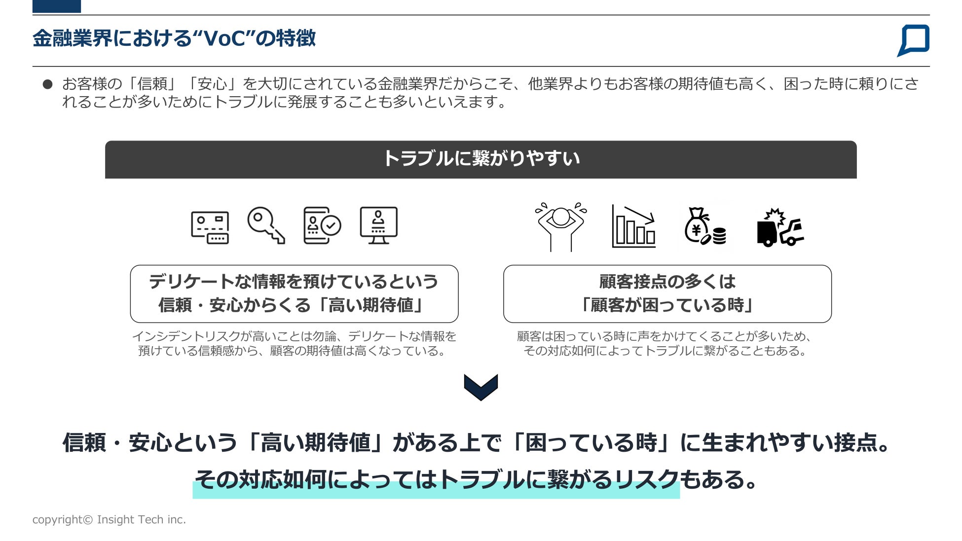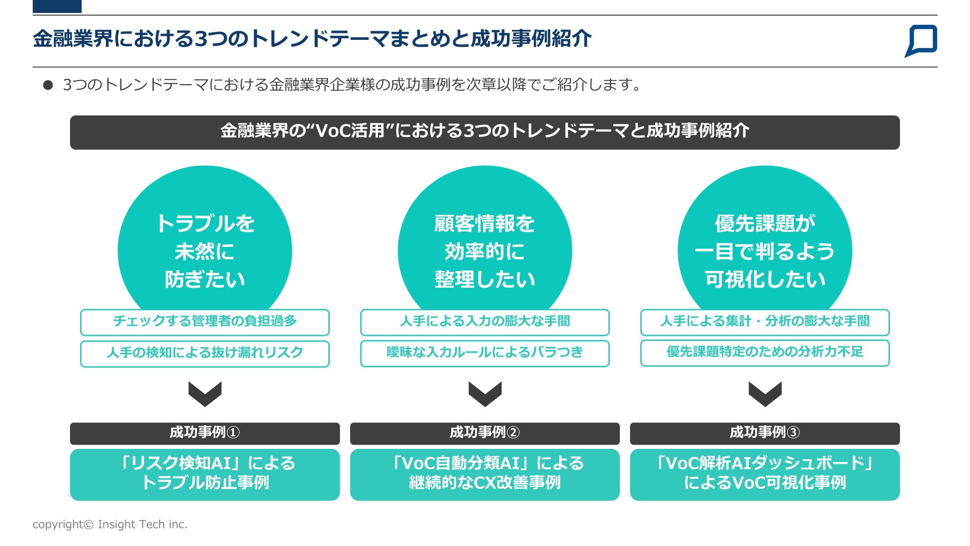 ◆金融業界におけるVoCの特徴を踏まえてトレンドとなっている3つのテーマを扱っています。