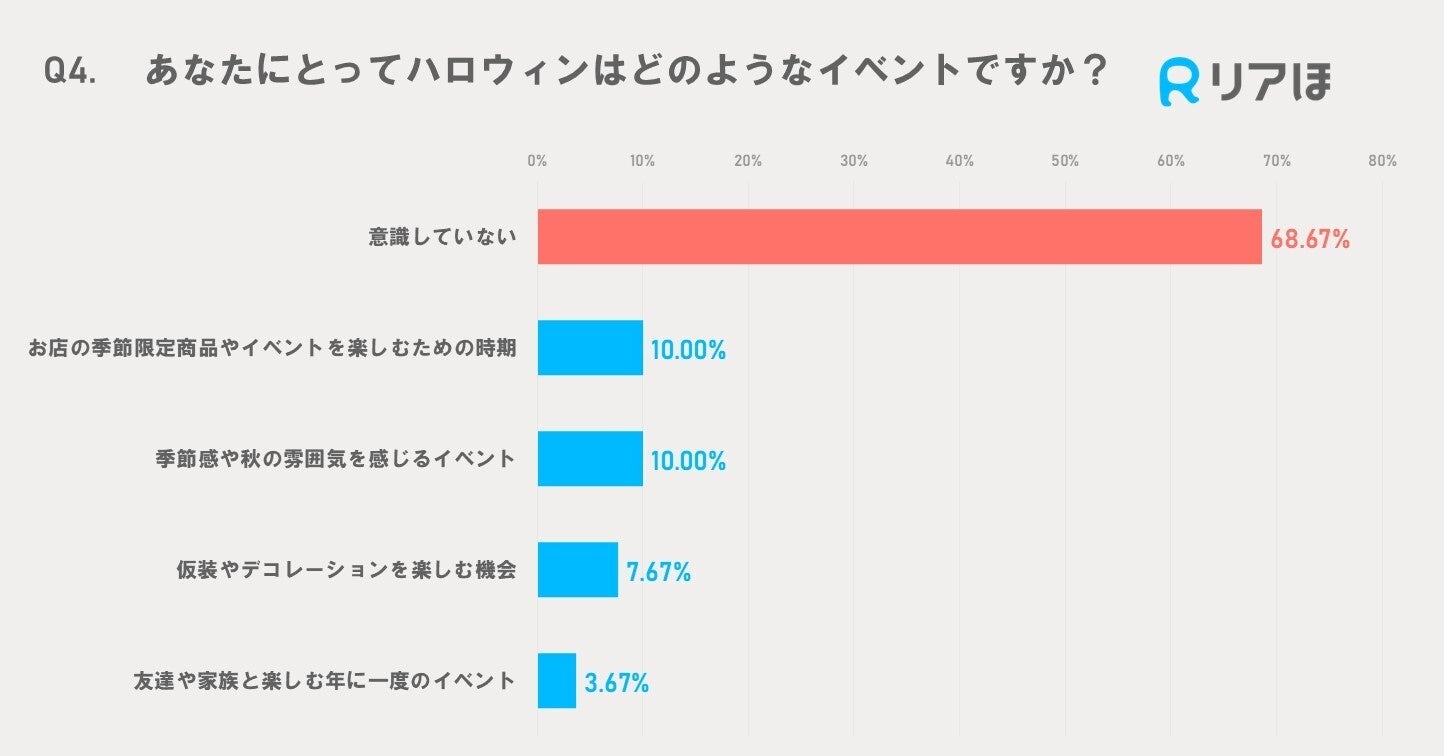 「意識していない」と回答した人が68.67%に達し、ハロウィンを特別なイベントと捉えていない人が多数派であることが判明しました。「お店の季節限定商品やイベントを楽しむための時期」や「季節感や秋の雰囲気を感じるイベント」として意識している人はそれぞれ10.00%で、限定商品や季節の雰囲気を楽しむきっかけとする傾向も一部見られました。