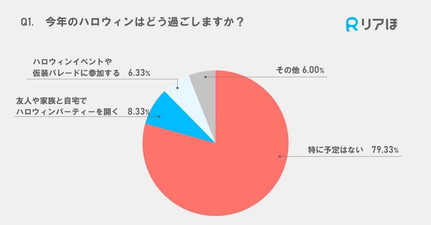調査の結果、今年のハロウィンに「特に予定はない」と回答した人が最も多く、全体の79.33%に上りました。一方、「友人や家族と自宅でハロウィンパーティーを開く」と答えた人は8.33%、「ハロウィンイベントや仮装パレードに参加する」と答えた人は6.33%と、外出やパーティーを楽しむ傾向は少数派であることが明らかになりました。