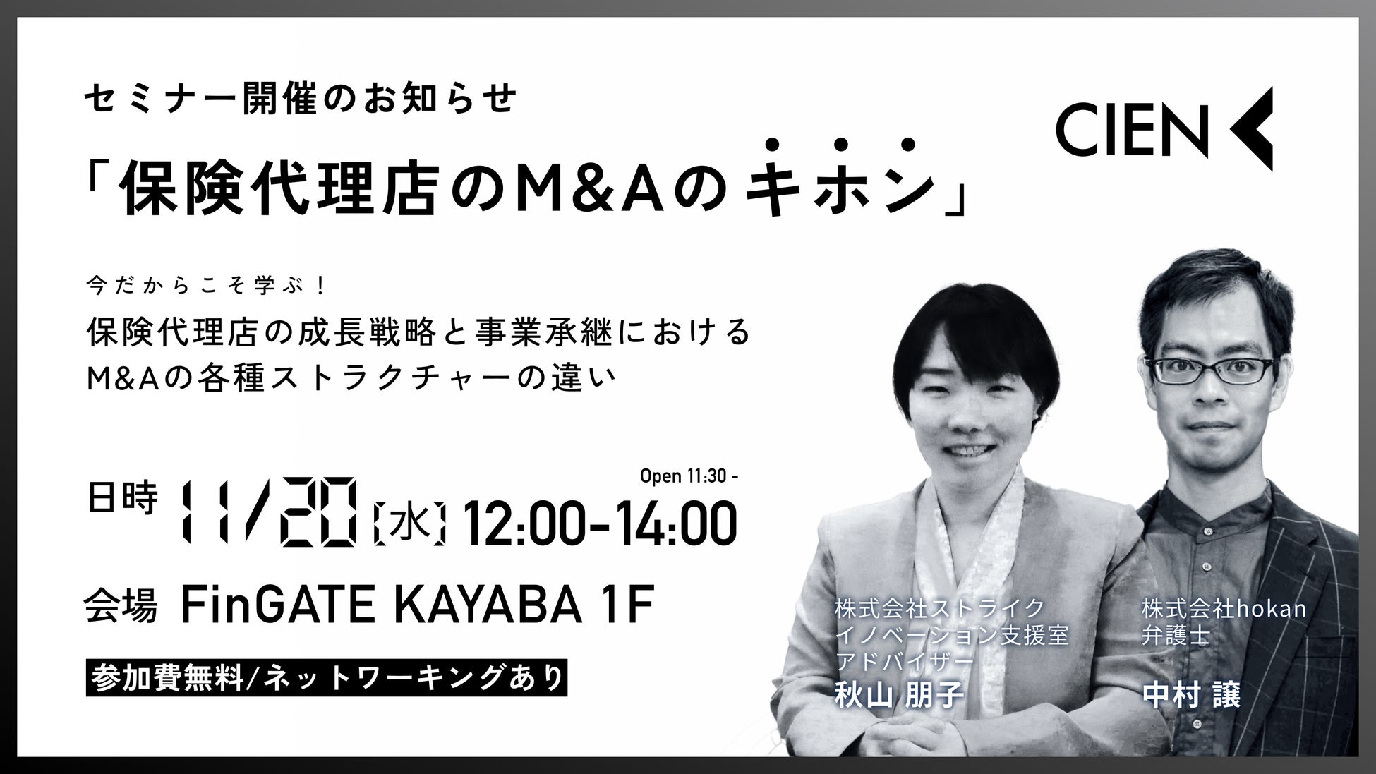 株式会社CIEN(シエン、本社:東京都中央区、代表取締役:小坂直之、以下:当社)は、CIEN M&A事業において、2024年11月20日(水)に株式会社ストライク秋山氏をお迎えし、保険代理店向けM&Aセミナーを開催することをお知らせいたします。