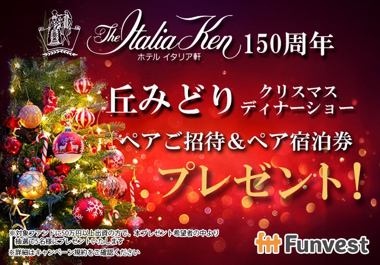 本ファンドに50万円以上の出資の方で、本プレゼント希望者の中から抽選で5名様に「ホテルイタリア軒150周年 丘みどりクリスマスディナーショー ペアご招待&ペア宿泊券」をプレゼント!