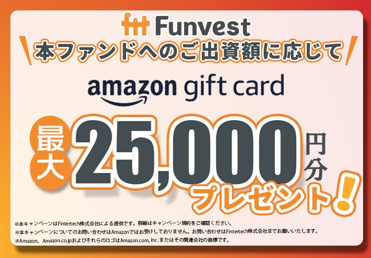 本ファンドへ出資していただいた投資家の皆様を対象として、出資額に応じて最大25,000円分のAmazonギフトカードをプレゼントするキャンペーンも併せて実施いたします。