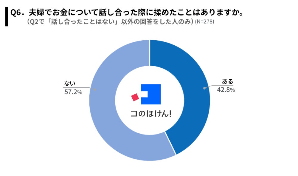 Q2で「話し合ったことはない」以外の回答をした人に対し、「夫婦でお金について話し合った際に、揉めたり喧嘩になったことはありますか。」(N=278)と質問したところ、「ある」が42.8%、「ない」が57.2%という結果になりました。