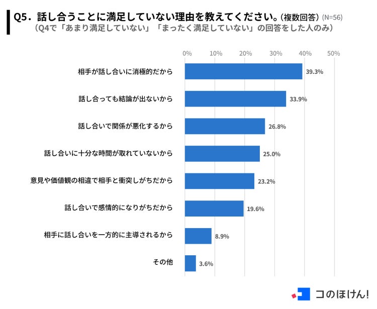 Q4で「あまり満足していない」「まったく満足していない」と回答した人に対し、「夫婦でお金について話し合うことに、満足していない理由を教えてください。(複数回答)」(N=56)と質問したところ、「相手が話し合いに消極的だから」が最多の39.3%、次いで「話し合っても結論が出ないから」が33.9%、「話し合いで関係が悪化するから」が26.8%という結果になりました。