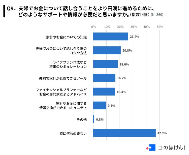 「夫婦でお金について話し合うことをより円満に進めるために、どのようなサポートや情報が必要だと思いますか。(複数回答)」(N=360)と質問したところ、「家計やお金についての知識」が最多の26.4%、次いで「夫婦でお金について話し合う際のコツや方法」が20.8%、「ライフプラン作成など将来のシミュレーション」が18.6%という結果になりました。