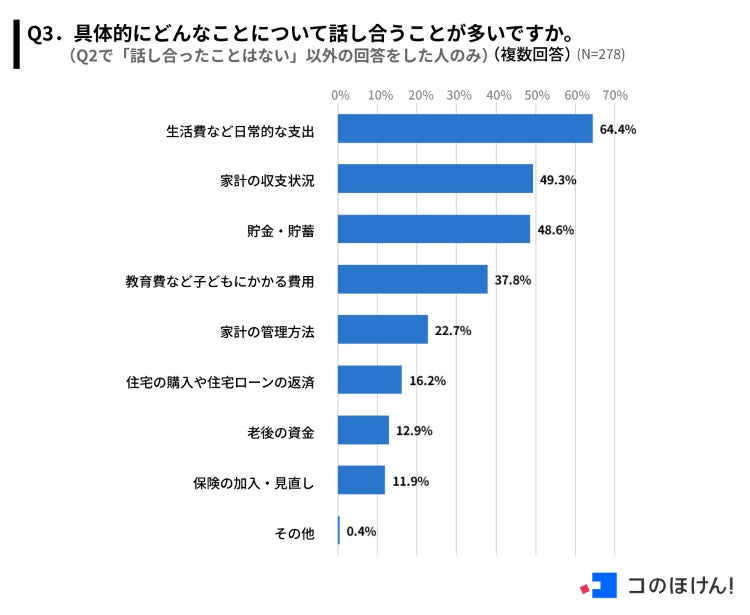 Q2で「話し合ったことはない」以外の回答をした人に対し、「具体的にどんなことについて話し合うことが多いですか。(複数回答)」(N=278)と質問したところ、「生活費など日常的な支出」が最多の64.4%、次いで「家計の収支状況」が49.3%、「貯金・貯蓄」が48.6%という結果となりました。