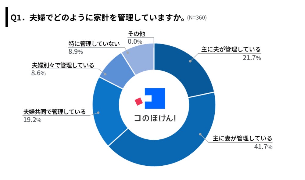 「夫婦でどのように家計を管理していますか。」(N=360)と質問したところ、「主に妻が管理している」が最多の41.7%、次いで「主に夫が管理している」が21.7%、「夫婦共同で管理している」が19.2%という結果になりました。
