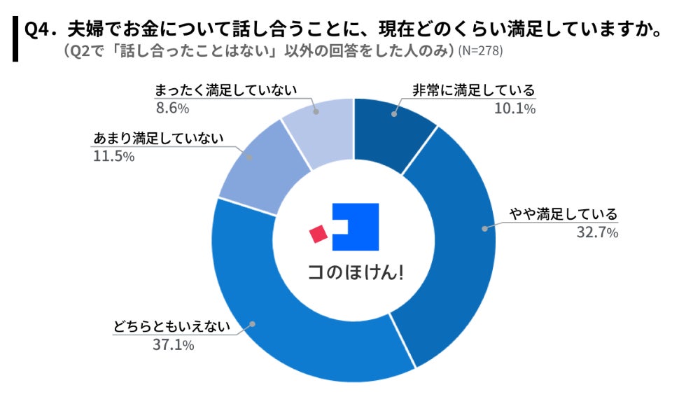 Q2で「話し合ったことはない」以外の回答をした人に対し、「夫婦でお金について話し合うことに、現在どのくらい満足していますか。」(N=278)と質問したところ、「満足している」が42.8%(※「非常に満足している」「やや満足している」の合計)、「満足していない」が20.1%(※「あまり満足していない」「まったく満足していない」の合計)という結果になりました。
