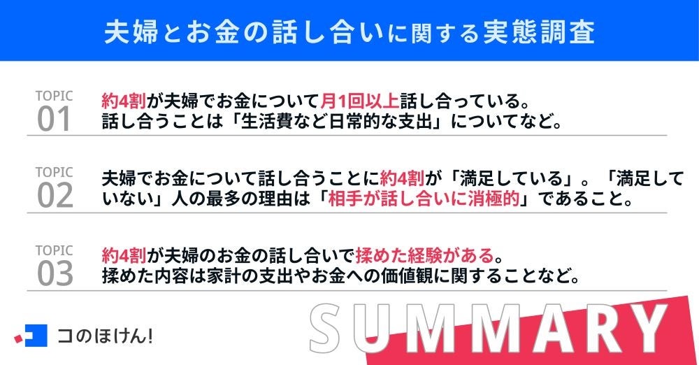 Sasuke Financial Lab株式会社(本社:東京都千代田区、代表取締役:松井 清隆、以下「当社」)が運営する保険の一括比較・見積もりサイト「コのほけん!(https://konohoken.com/)」は、全国の20歳~59歳の既婚の男女360名を対象に、2024年11月12日~13日の2日間においてインターネットリサーチによる「夫婦とお金の話し合いに関する実態調査」を実施しました。