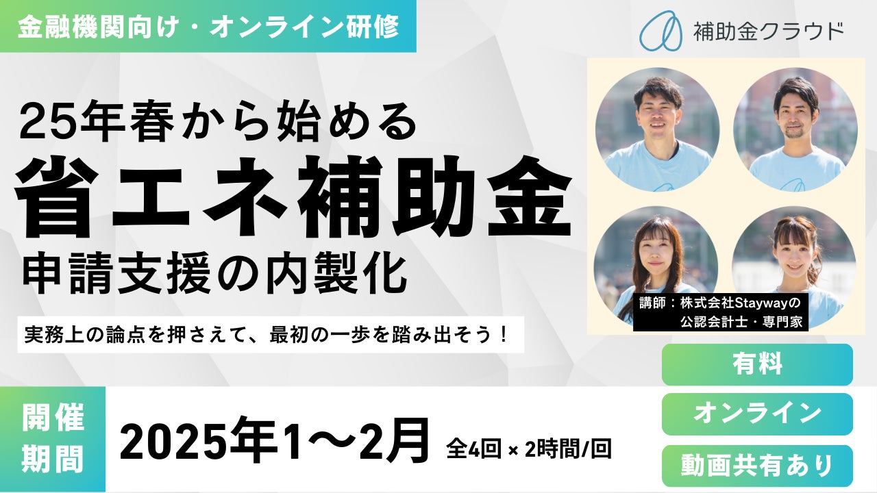 この度、補助金クラウドを運営する株式会社Stayway(本社:大阪府大阪市、代表取締役: 佐藤淳、以下「Stayway」)は、金融機関向けに「25年春から始める『省エネ補助金申請支援の内製化』オンライン研修」を開催いたします。