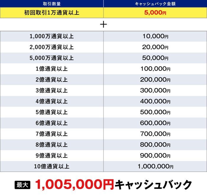② 取引期間中の新規約定数量の合計が1,000万通貨以上のお取引(①が未達成でも、下記「■キャッシュバック条件」記載の取引数量及びキャッシュバック金額により、条件達成者全員にキャッシュバック)