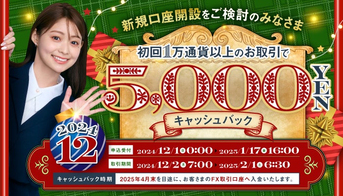 12月に新しく口座開設いただいたお客さまを対象に、初回お取引1万通貨以上でもれなく5,000円をキャッシュバック、さらに期間中のお取引数量に応じて、最大100万円をキャッシュバックいたします。
