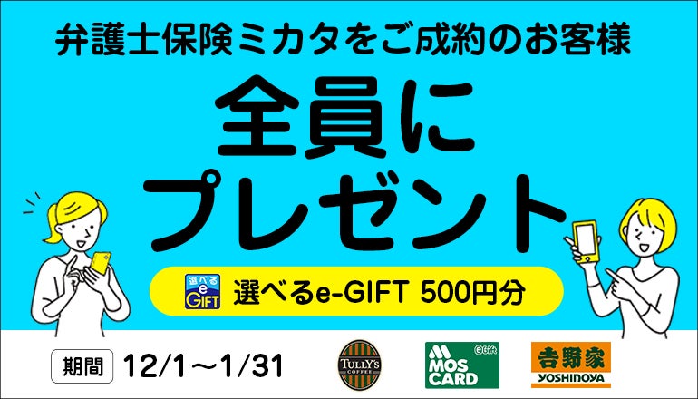 対象期間中に弁護士保険STATION経由で、ミカタ少額短期保険株式会社「弁護士保険ミカタ」の契約申込を完了し、ご契約が成立されたお客様全員に「選べるe-GIFT 500円分」をプレゼントします。