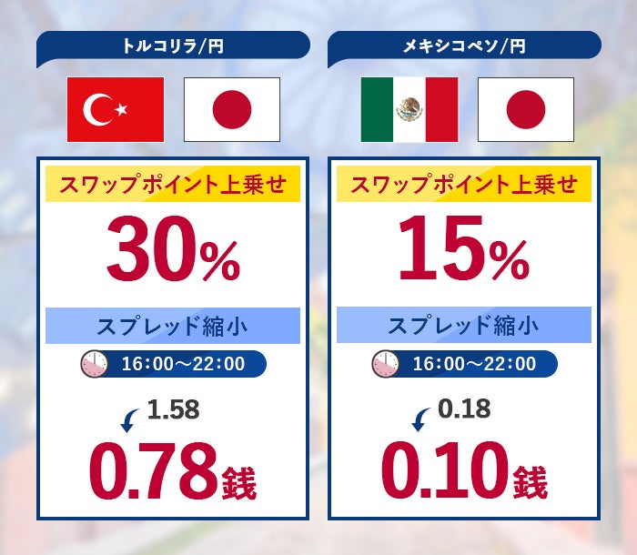 キャンペーン期間中にトルコリラ/円(TRY/JPY)・メキシコペソ/円(MXN/JPY)において新規建てしたポジションを対象に、受取スワップポイントに上乗せして、下表の通りキャッシュバックいたします。増額率は、メキシコペソ/円は15%、トルコリラ/円は30%となります。 さらに、16:00~22:00の時間帯における1~1,000,000(100万)通貨までのお取引のスプレッドを縮小いたします。また、トルコリラ/円(TRY/JPY)・メキシコペソ/円(MXN/JPY)は、同時開催の「最高700万!預かり資産に応じて最大15%上乗せキャッシュバック!」の対象通貨ペアとなります。