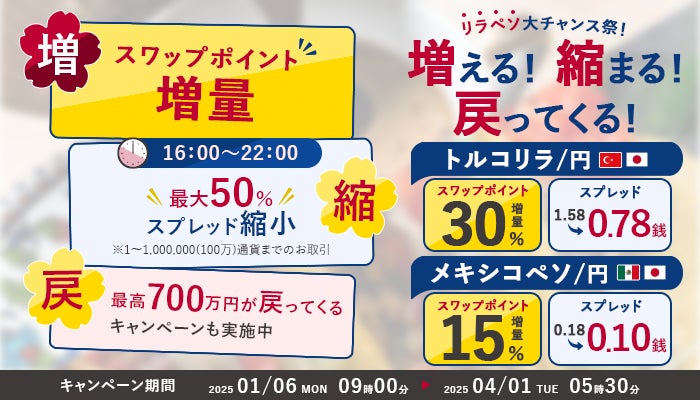 SBI FXトレード株式会社(本社:東京都港区、代表取締役社長:藤田 行生)は、本日よりトルコリラ/円(TRY/JPY)・メキシコペソ/円(MXN/JPY)において、新規建てしたポジションを対象に受取りスワップポイントに上乗せしてキャッシュバックするキャンペーンを実施いたします。増額率はトルコリラ/円で30%、メキシコペソ/円で15%となります。