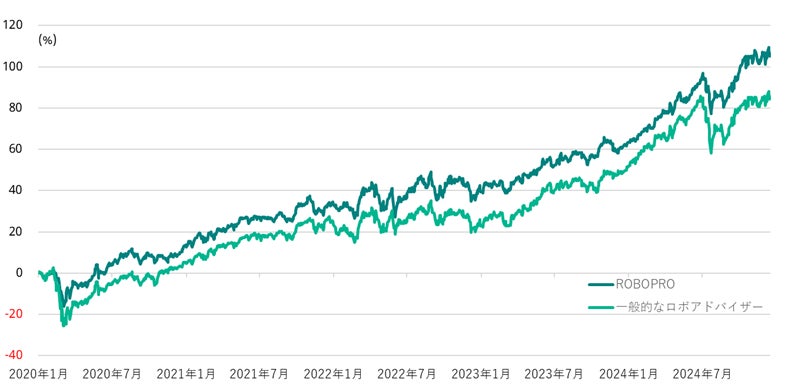 お客さまの資産を世界中の株式や債券などに自動で分散投資するロボアドバイザーの中でも、「ROBOPRO」は、AIで相場上昇・下落を予測し、その予測を基に投資配分をダイナミックに変更するという特徴を持つ、極めて独自性の高いサービスです。2020年1月の「ROBOPRO」サービス開始以降、2020年2~3月にかけての「コロナ・ショック」とよばれる株価の大幅下落局面や、その後の景気回復局面、世界的な金利の急激な上昇に伴う調整局面、2024年夏の相場変動局面など、多様な相場展開がありました。そうした様々な局面において「ROBOPRO」は、AIによる相場予測を基に臨機応変に対応した結果、一般的なロボアドバイザーと比較して好調なパフォーマンスを残してきました。「ROBOPRO」の運用実績は、リリースされた2020年1月15日から2024年12月30日までの期間で見ると、以下のグラフのように推移しており、12月30日時点では+105.08%(※1)となり、一般的なロボアドバイザーを20.68%上回る実績が出ています(※2)。