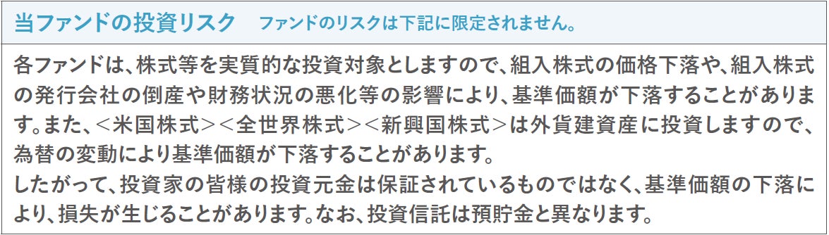 <ご留意事項>◆ファンドは、元金が保証されているものではありません。◆ファンドに生じた利益および損失は、すべて受益者に帰属します。◆投資信託は金融機関の預金と異なり、元本は保証されていません。◆投資信託は預金保険の対象ではありません。また、登録金融機関が取り扱う投資信託は、投資者保護基金制度が適用されません。◆金融商品取引所等における取引の停止等、その他やむを得ない事情があるときは、ご購入、ご換金の各お申込みの受付を中止すること、および既に受付けたご購入、ご換金の各お申込みの受付を取消すことがあります。