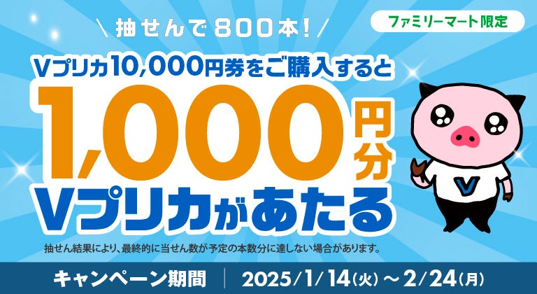 ファミリーマートに設置されているマルチコピー機で、Vプリカ10,000円券を購入すると抽せんで800本、1,000円分のVプリカがあたる!