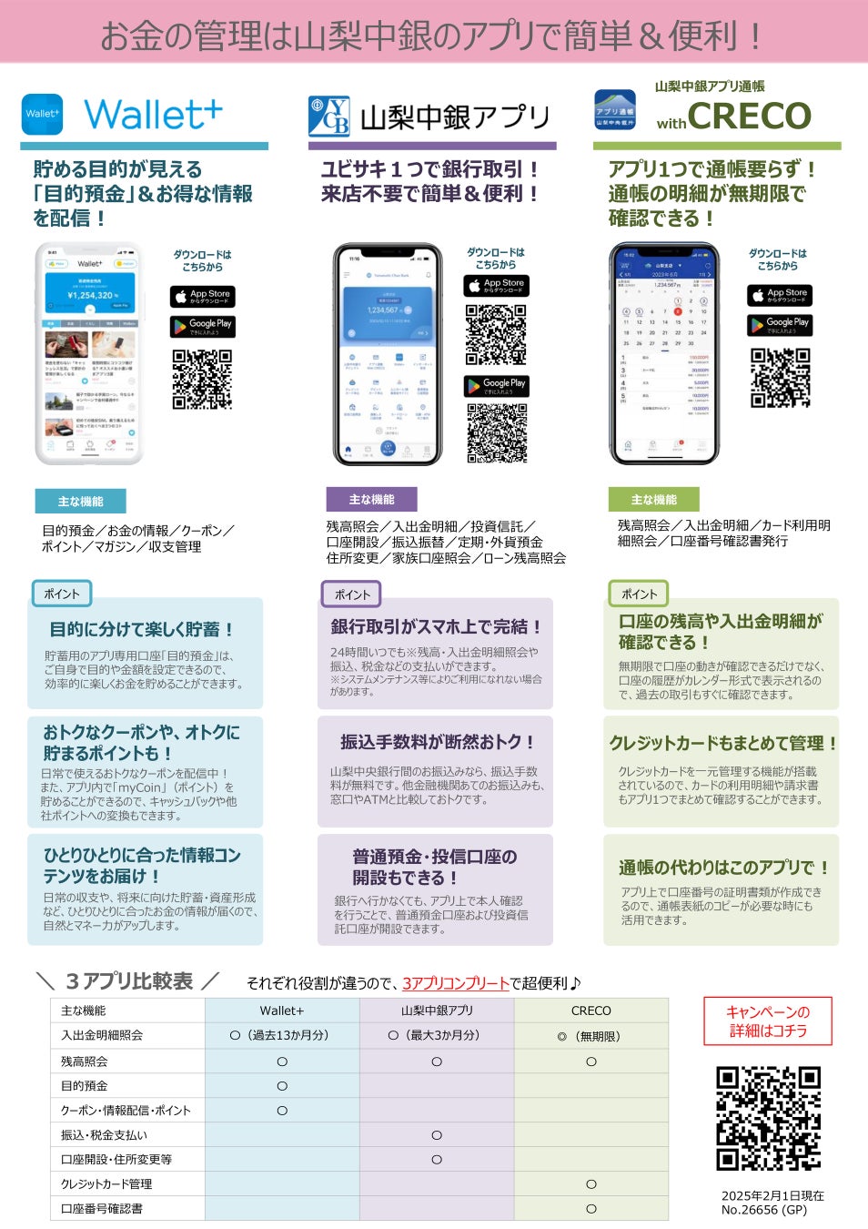 株式会社山梨中央銀行(頭取 古屋 賀章)は、現在3種類のアプリ(※、以下「3アプリ」といいます)を取り扱っております。
