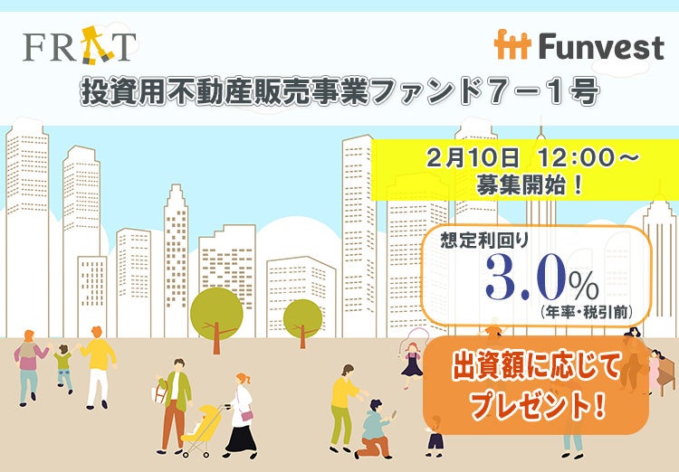 「未来をわかちあう投資」を提供する「Funvest(ファンベスト)」(以下、Funvest)は、「FRAT 投資用不動産販売事業ファンド7-1号」(以下、本ファンド)の募集を2/10より開始しますので、お知らせいたします。