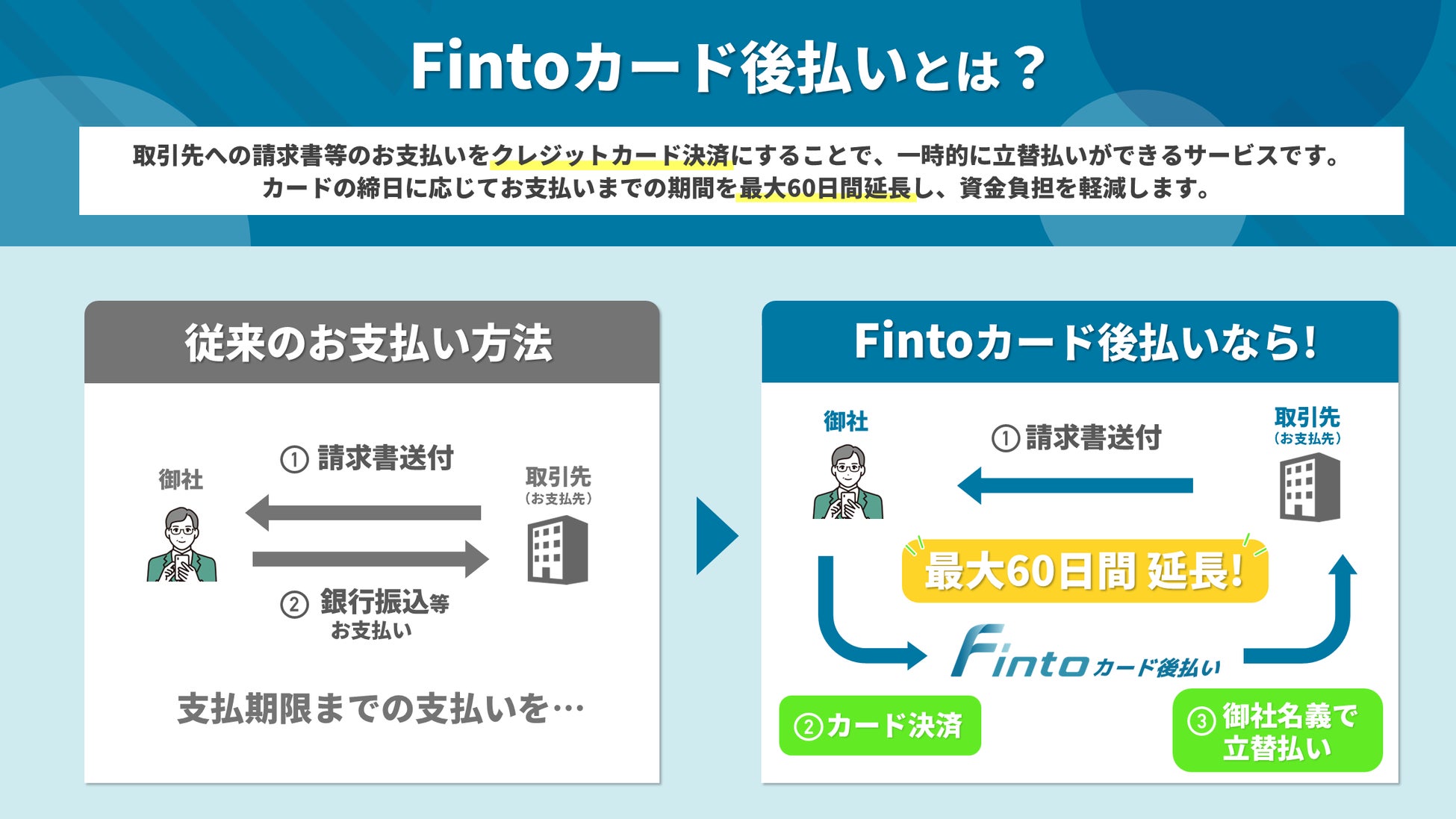Finto」は、これまで「トラボックス請求受領」でご提供してきた請求管理サービスとカード後払いサービスを、「Fintoカード後払い」(https://finto.jp/bpsp)と「Finto請求受領」(https://finto.jp/bill)とにサービスを分け、ご利用いただくお客様にとってよりわかりやすいサービス・料金プランで