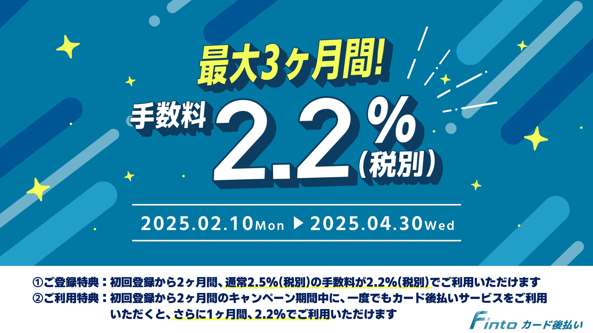 初回登録から2ヶ月間、カード後払い手数料を2.5%(税別)から2.2%(税別)でご利用可能です。