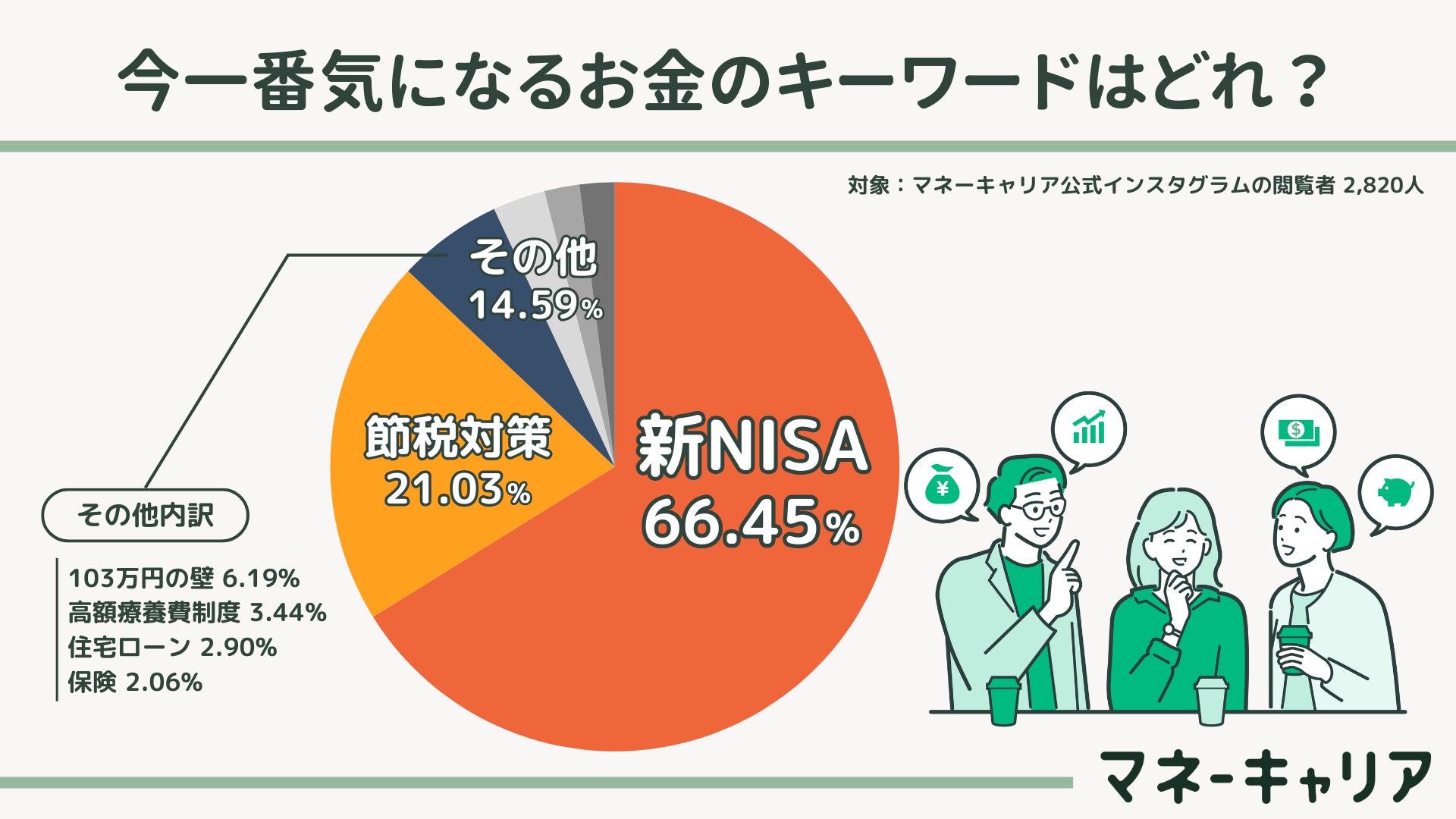 マネーキャリアが実施したインスタグラムアンケーにおいて、ユーザーの65.1%が「新NISA」を最も気になるワードとして選択しました。