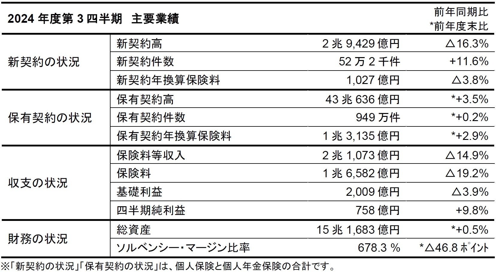 メットライフ生命保険株式会社(代表執行役 会長 社長 最高経営責任者 ディルク・オステイン)の2024年度第3四半期(2024年4月1日~2024年12月31日)の業績をお知らせします。