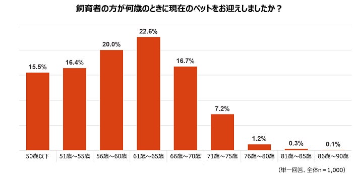 ペットをお迎えした際の飼育者の方の年齢をみると、「61~65歳」が22.6%で最多となりました。ペットのお迎えは70歳までに行う方が多く、本調査では70歳以下でお迎えした方が全体の91.2%にのぼりました。71歳以降でお迎えした方は僅か8.8%と、急激に減少することが判明しました。