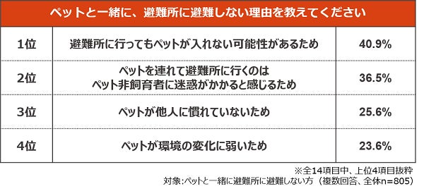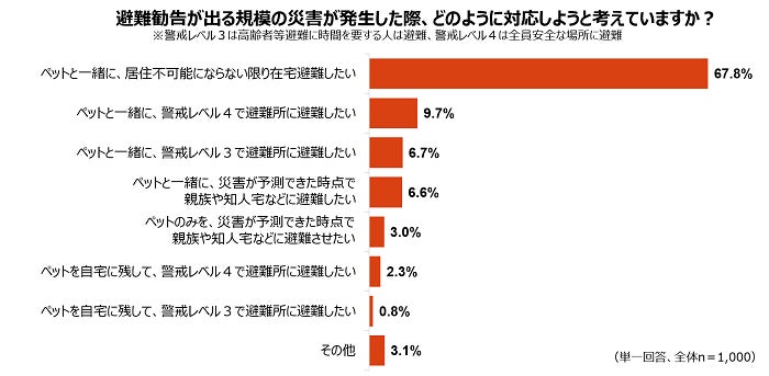続いて、災害に関する質問を行いました。まず、避難勧告が出る規模の災害が発生した際、どのように対応しようと考えているかを尋ねたところ、「居住不可能にならない限り在宅避難したい」と答えた方が最多で67.8%に至りました。多くの方が避難所に行かない意向ですが、その理由を尋ねたところ「避難所に行ってもペットが入れない可能性があるため」が40.9%、「ペットを連れて避難所に行くのはペット非飼育者に迷惑がかかると感じるため」が36.5%となりました。避難所に行っても確実に入れるとは限らないこと、入れたとしても周囲の方に迷惑になる可能性があることなどが、避難を避ける要因の一つになっているようです。
