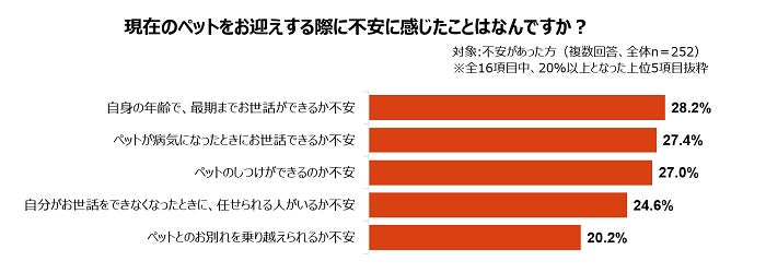 不安の内容としては、「自身の年齢で、最期までお世話ができるか不安」(28.2%)、「ペットが病気になったときにお世話できるか不安」(27.4%)、「ペットのしつけができるのか不安」(27.0%)の3つがそれぞれ3割弱という結果であり、健康面の不安が上位にくる傾向がみられました。