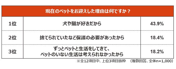 続いて、現在のペットをお迎えした理由を尋ねたところ「犬や猫が好きだから」が43.9%で最多となりました。2位には「捨てられていたなど保護の必要があったから」(18.4%)が続きますが1位との差は大きく、元々「犬や猫が好き」であるというのが大きな飼育動機となっているようです。