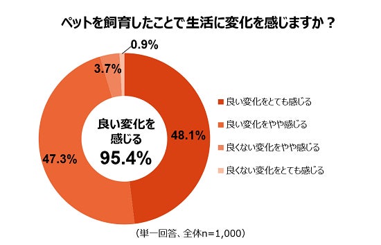 ペットを飼育したことで生活に変化を感じるか尋ねたところ、なんと95%以上の方が「良い変化を感じる」と回答し、ペットとの暮らしをポジティブに受け止めている方が非常に多い結果となりました。