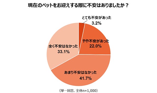 ただ、ペットをお迎えした4人に3人は「不安はなかった」との回答であり、ペットの飼育に不安を感じていた方は全体でみると少数のようです。これまでの飼育経験を尋ねた設問では、約8割が「自身が過去に犬もしくは猫を飼育していた」と回答していたこともあり、すでに飼育経験があって勝手がわかるからこそ不安を感じにくい面もあるのかもしれません。