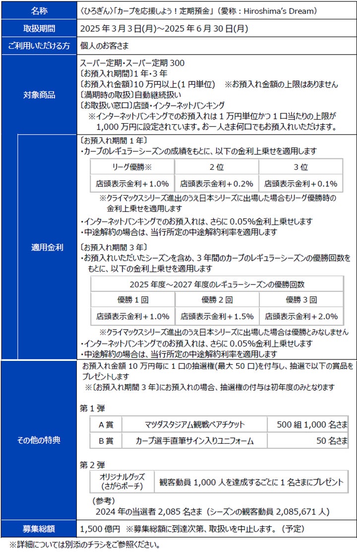 株式会社広島銀行(頭取 清宗 一男)は、広島東洋カープ(以下、「カープ」)の活躍の後押しと地域の活性化への貢献を目的として、今年も「〈ひろぎん〉カープを応援しよう!定期預金」の取扱いを開始します。